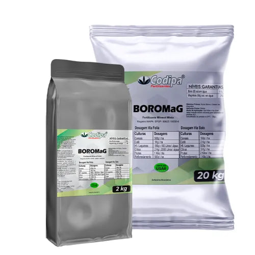O BOROMaG é essencial para o desenvolvimento de raízes e transporte de açúcares na planta. O Boro atua na síntese de ácidos nucléicos e divisão celular, enquanto o Magnésio otimiza a absorção de luz para a fotossíntese.
