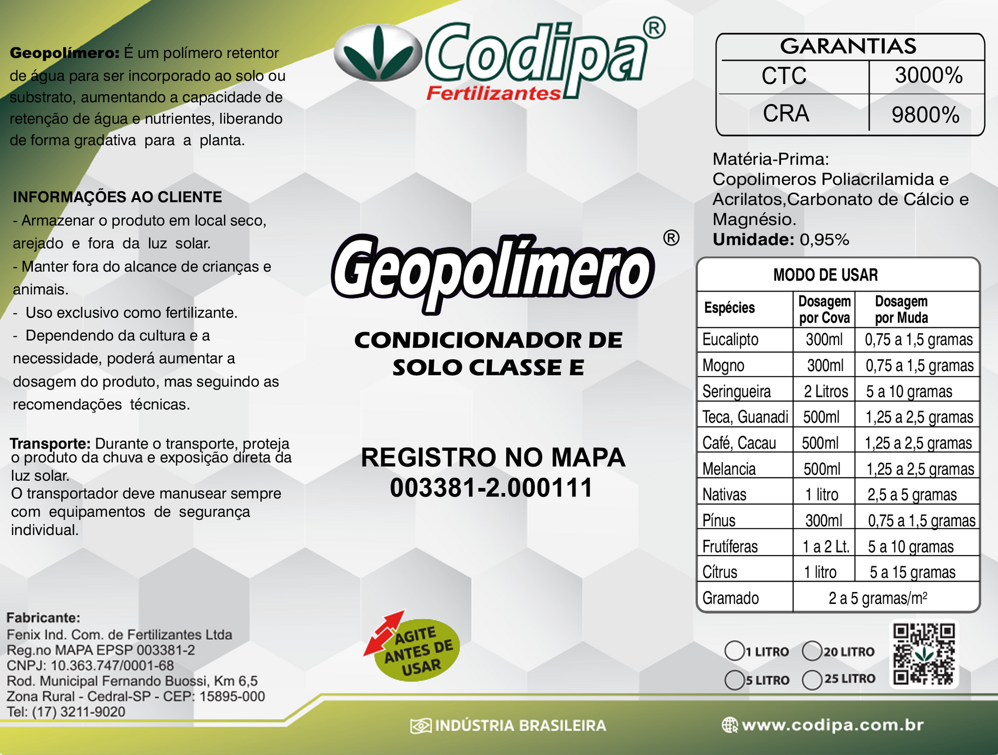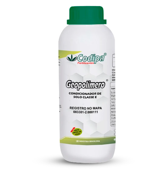 O Geopolímero é um condicionador de solo Classe E, desenvolvido para aumentar drasticamente a retenção de água e nutrientes, liberando-os gradativamente para a planta.