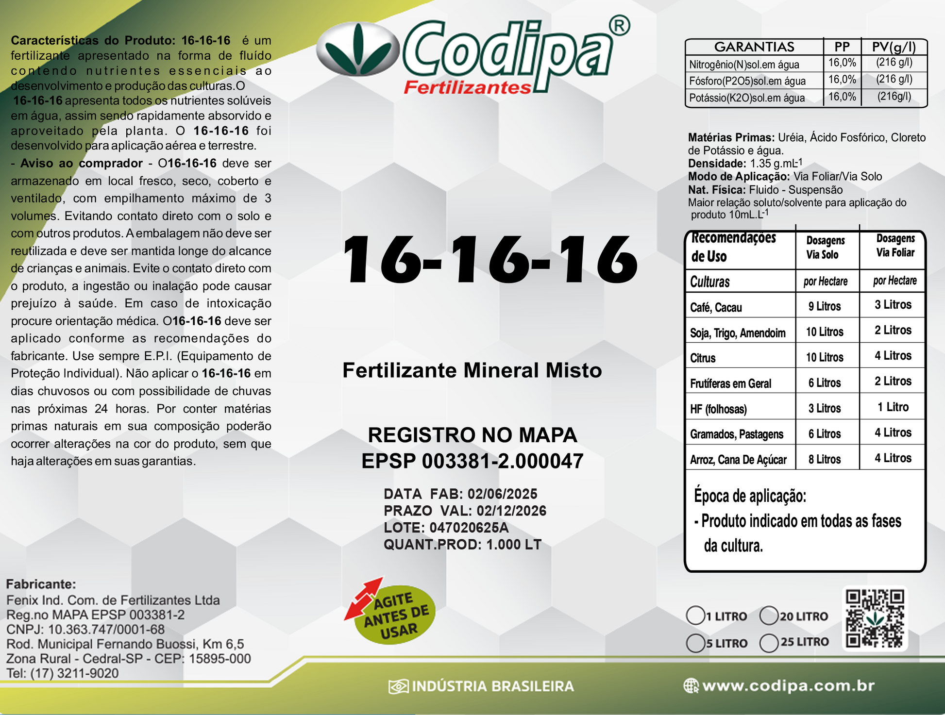 - Garantias: N (16% - 216 g/l), P2O5 (16% - 216 g/l), K2O (16% - 216 g/l).